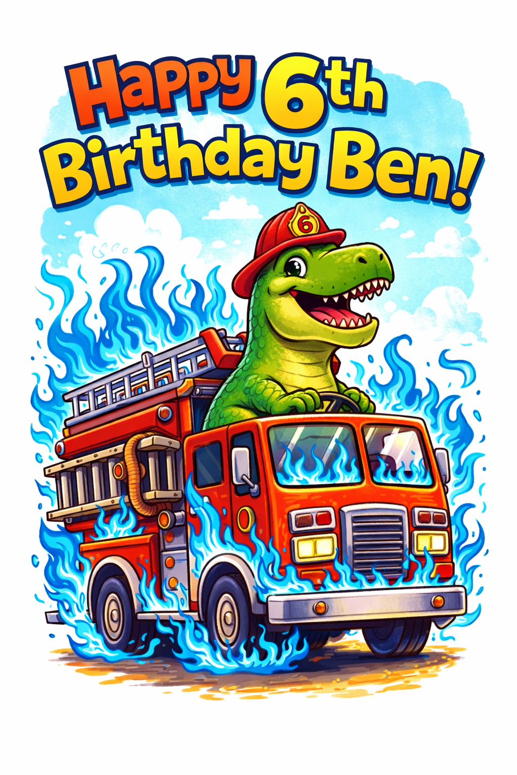 His name is Ben. "Happy 6th Birthday Ben!" Favorite color: red. T-Rex should look confident and heroic, not scary. Fire truck on fire in a fun cartoonish way. He wants the flames blue for some reason. Printable on cardstock.