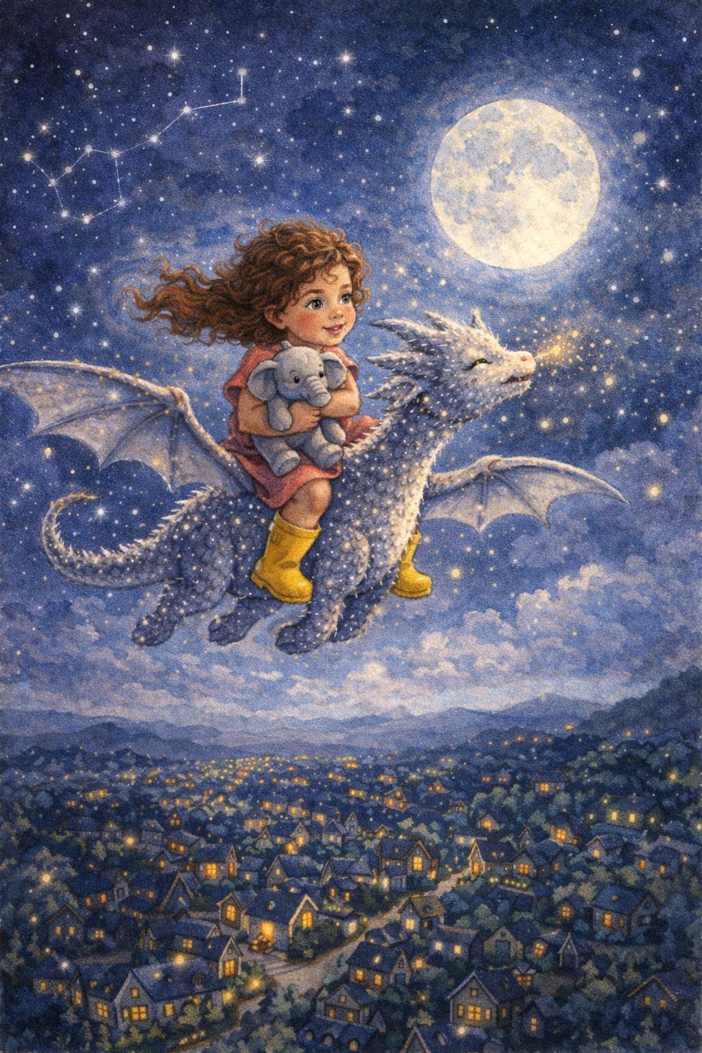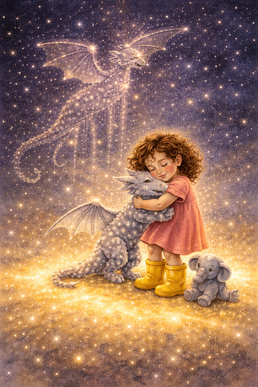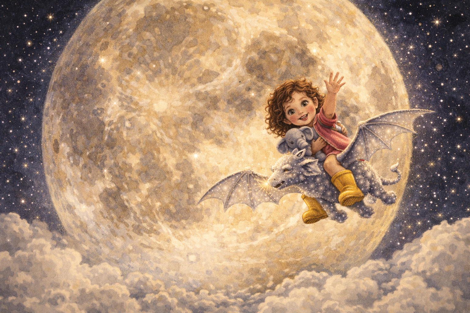 My daughter Zoe is 4 and she's been begging me to "write a book about me but with dragons." She 100% believes she could befriend a dragon if she just found one. She's also going through a big space phase — stars, moons, the whole deal. I want an actual story, not just a paragraph. Something with a beginning, middle, and end that she'll make me read every single night for the next six months. She always wears rain boots even when it's sunny and carries a stuffed elephant named Mr. Trunk everywhere — if he shows up in the story she will absolutely lose it.
