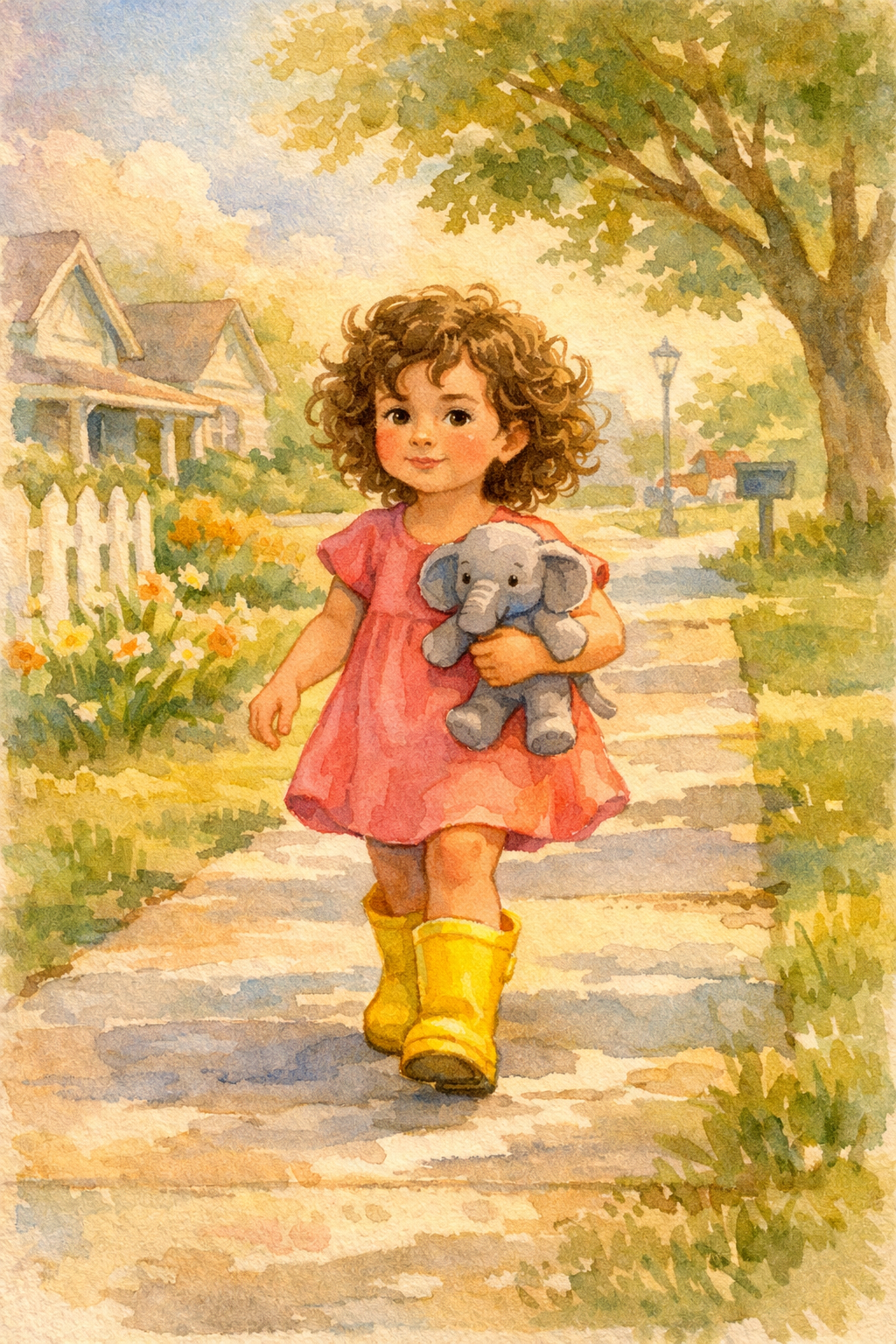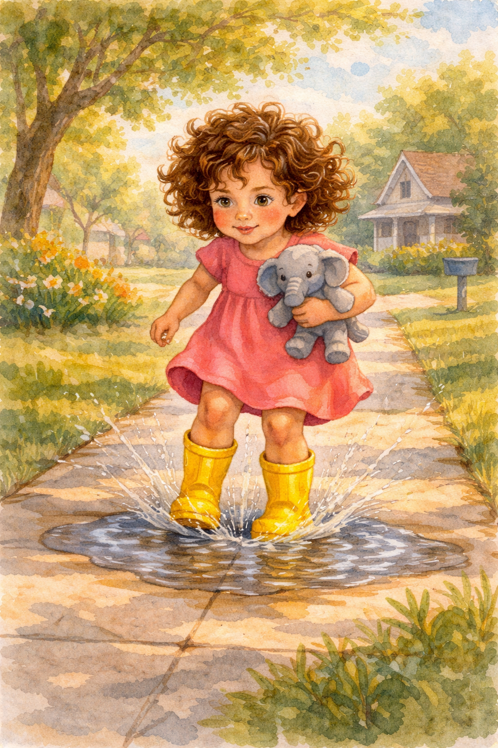 Curly brown hair, rain boots, Mr. Trunk the elephant. Simple enough for a 4-year-old, not boring for an adult reading aloud. 12-15 pages. She's not scared of anything "except the dark part of the pool."