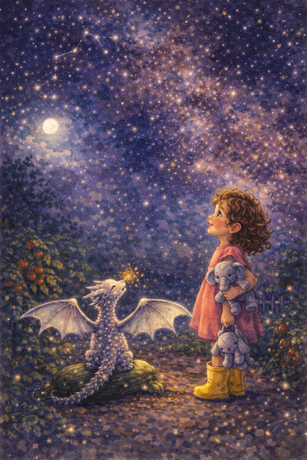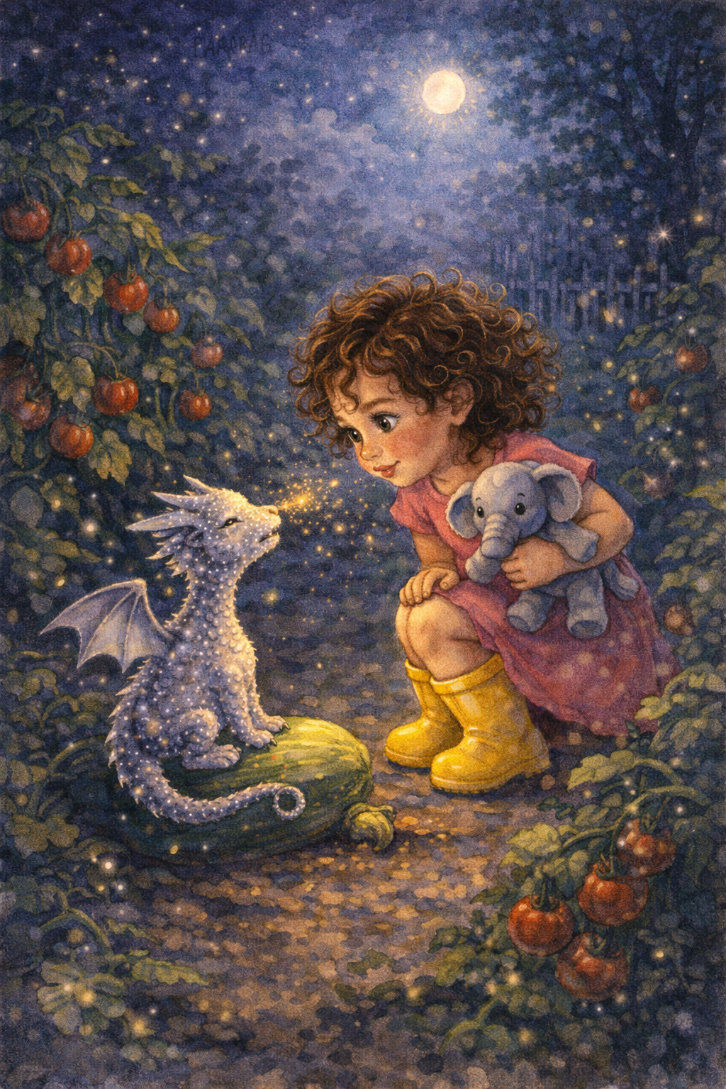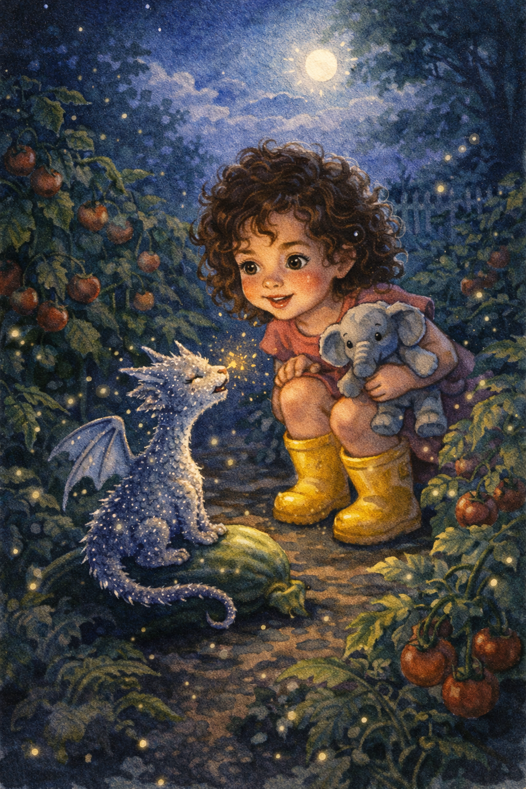 Between the tomato plants and the squished zucchini sat a tiny dragon — no bigger than a cat — covered in silver scales that sparkled like stars.